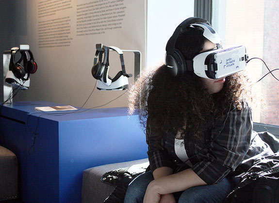 Student Eva Elbez watches a 3D movie with virtual reality glasses at the Phi Center in Montreal, QC, on Thursday, Feb. 18, 2016. Elbez is taking a class on cinematography. She went to visit the virtual reality exhibition of the center to understand future trends in filmmaking (William Fox / Course JOUR366 at Concordia University)
